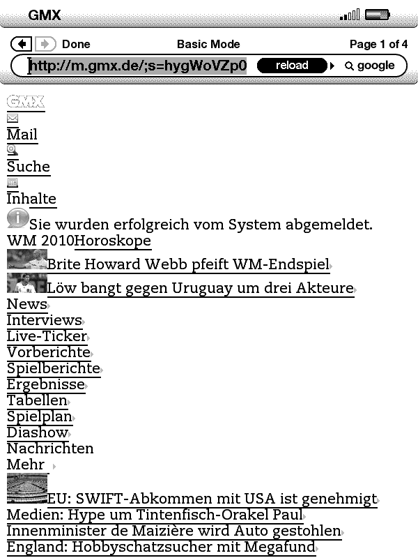 Googlemail habe ich noch nicht ausprobiert, aber z.B. GMX-Mail funktioniert. Der GMX-Server erkennt, dass der Aufruf von einem mobilen Gerät kommt, macht also von sich aus www.gmx.de schon m.gmx.de Auf der Startseite ganz oben den Link um sich einzuloggen, ein wenig News und so sind auch drauf. Anbei 2 Screens wie es ausschaut (Kindle 2) Grüße aus München, Pascal |
