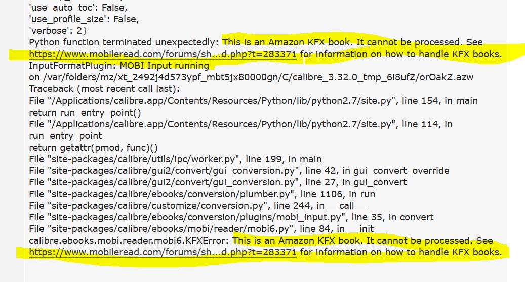 (b) That's a conversion log. When you ask for detailed help at Alf's blog or Harper's github repository, remember that DRM removal happens on import, not conversion, so you'll need to post an import log. |