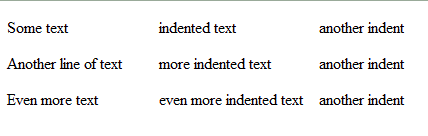 <p>Some text<span class="indent1">indented text</span><span class="indent2">another indent</span></p> <p>Another line of text<span class="indent1">more indented text</span><span class="indent2">another indent</span></p> <p>Even more text<span class="indent1">even more indented text</span><span class="indent2">another indent</span></p> Last edited by jgray; 11-26-2010 at 10:59 PM. |