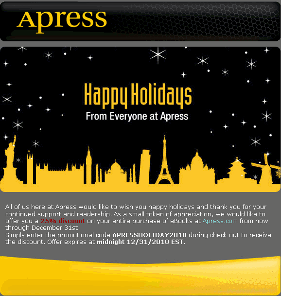 Apress - 25% off. Offer expires at midnight 12/31/2010 EST