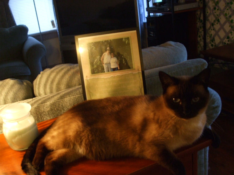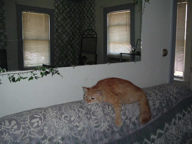 Ok, here's some of ours: The orange longhair is Buddy, the original slacker kitty, and the Siamese is, of course, Sinatra.