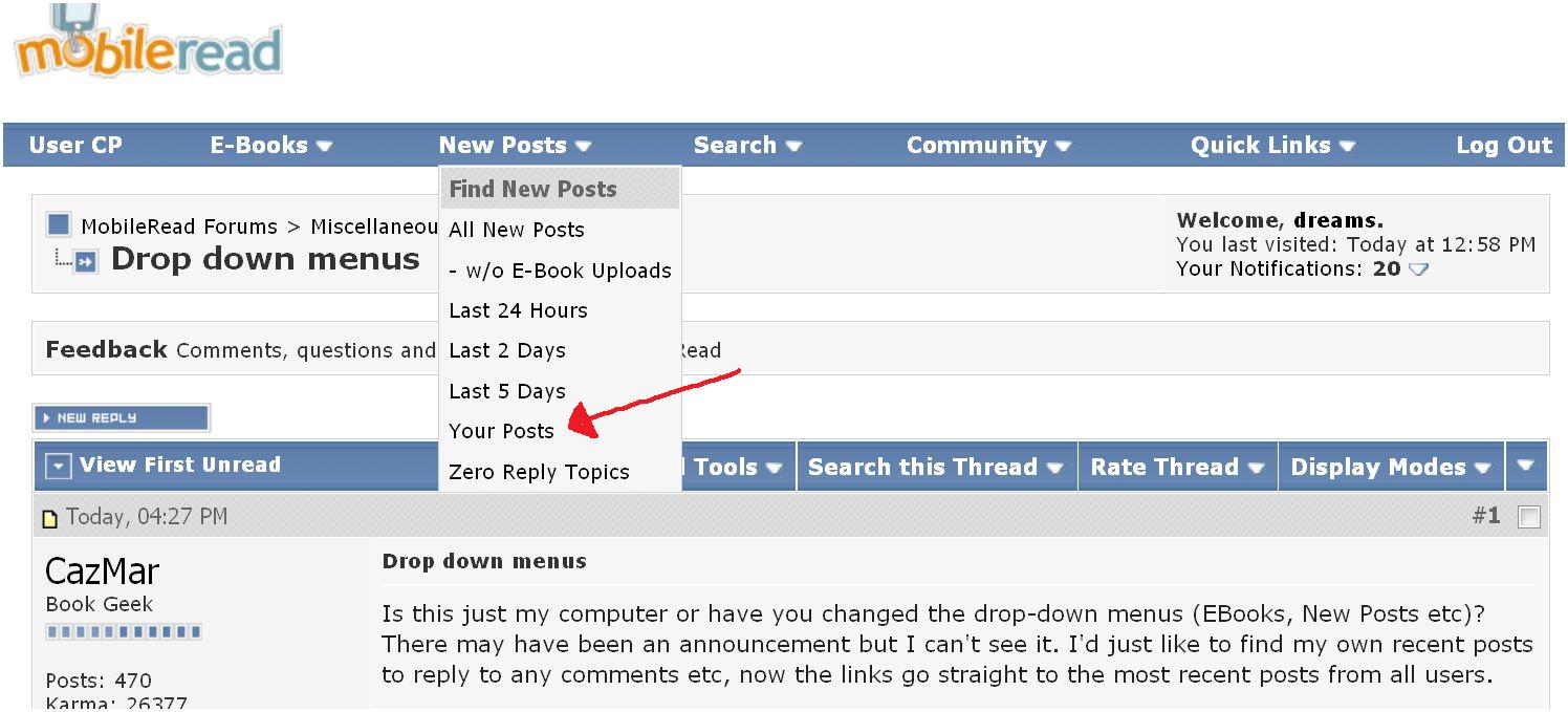 Is this just my computer or have you changed the drop-down menus (EBooks, New Posts etc)? There may have been an announcement but I can't see it. I'd just like to find my own recent posts to reply to any comments etc, now the links go straight to the most recent posts from all users.