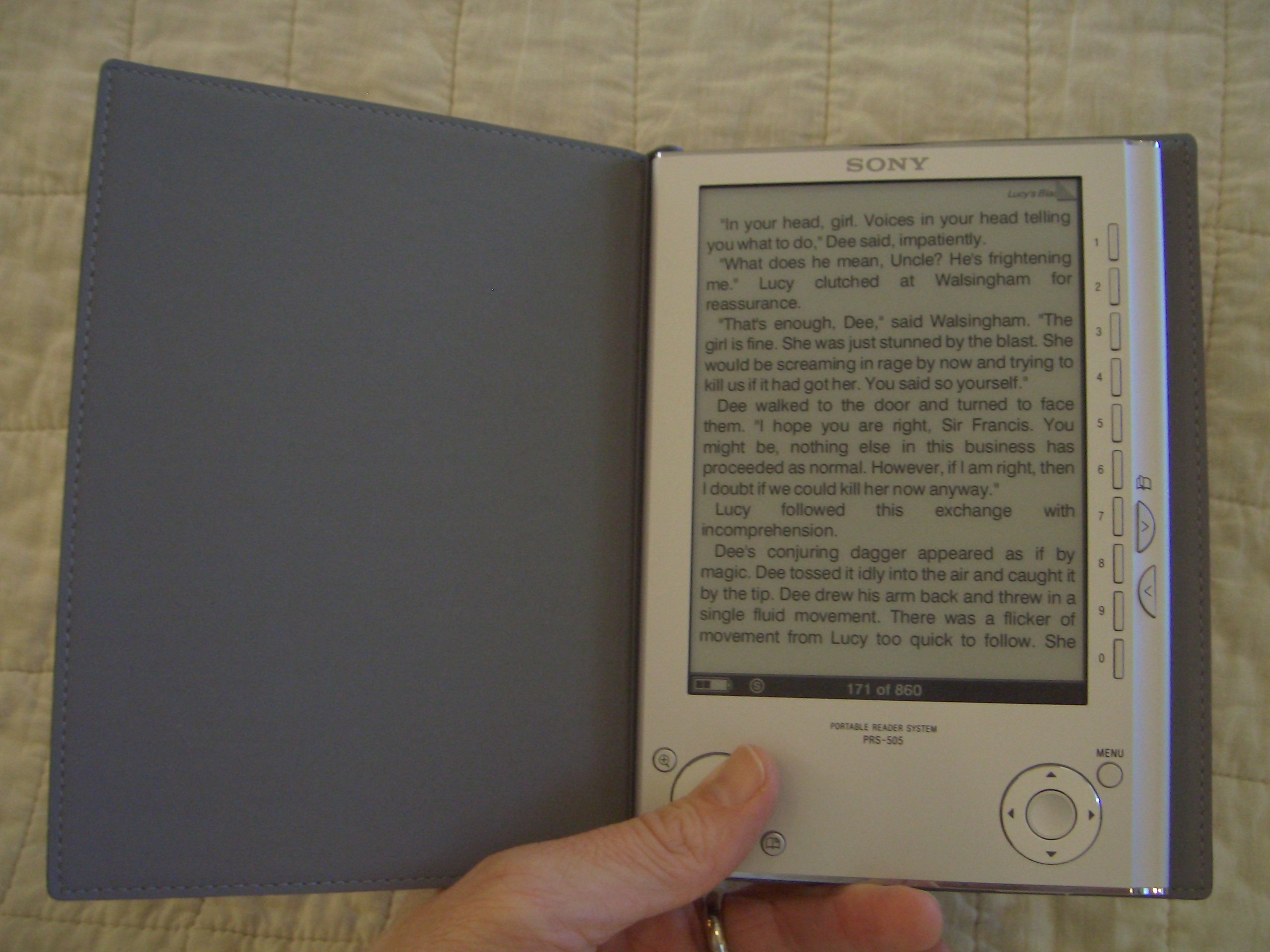 Through the gracious auspices of Sony's PR firm, PainePR, I've had the chance to review a 505 unit for the last two weeks (alas, it goes back to them today).In that time I've tried to focus on the differences that I've seen between the two models, and consider what I think of those differences. I will inevitably re-cover some items that others have mentioned, please bear with me, I'll try to bring out something new on those points, but some I just consider particularly important. As you will see below, I also tried to get some good figure study shots of the 505, and where applicable side-by-side comparison shots with my much loved 500. I'm not the best photographer in the world, nor do I have a fancy set-up, but hopefully the pix will answer some questions for some folks. I'll start with the Desktop software because I can cover it fairly quickly. Formerly known as the Connect Reader Software, the new version (as most will know) goes by the name of eBook Library. The new software installed easily over the existing one without any issues that I noticed, even replacing the existing icons for the old software with icons for the new one. I assume that it wouldn't find shortcuts that are in non-standard locations, however, I can't confirm that as I didn't really have any other than the ones the original software created. It found my existing books, and left my collections as they were, and seems to run a bit faster than the old version. In particular, registering the new device seemed markedly faster, but that could also be improvements in the on-line portion of the operation since the time I registered my 500 last year. I've also found it to be more stable than its predecessor. A brief note on the Connect Store. I noticed a detail or two in the ConnStore that seem worth mentioning here. I believe the wishlist feature they've added has come up already, but I noticed that you can set up a request for notices of new books by specific authors. This seems like a great idea to me, as I tend to follow certain authors. Okay, on to the 505 itself! I should probably start with the display. I've included a couple of side-by-sides of the displays. They're not all that great quality-wise, but they do give a good idea of the difference between the displays themselves, you just have to adjust mentally for the fact that both shots are darker than the reality. The page turn speed may be (very) slightly faster, but the change in the way that the image is refreshed makes it seem to come up faster, and I found it less bothersome than the old one (which, admittedly, didn't bother me much in the first place). The new display is noticeably brighter, and as others have commented, that makes a big difference in lower light situations. I suspect it will be easier to find good clip-on lights for the 505 than it has been for the 500. The most noticeable speed improvement on the display is in navigating menus, where it is markedly quicker. The unit casing is, as nearly as I can tell, a seamless metal sleeve, with caps at either end. I didn't try to open it (which would be rude), but it looks to me like the thing would be a bear to open without knowing exactly what you were doing. I do like the feel of the casing, texture-wise, but having now seen a silver unit in person, I have to say I remain in "dark-blue" case camp. I do feel that the silver de-emphasizes the e-ink's contrast somewhat. The stock cover is a nice faux leather (some sort of vinyl at a guess), and I particularly like the fact that it has no nape, inside our out, to pickup dust and such. The cover does fold all the way back, and makes for a nice holding feel. I found that by putting my index (pointing) finger between the two covers, I had a very good grip on the device (see the pix below). As a point of interest, though I've been a big proponent of the wrist lanyard for the 500 model, I didn't miss it on the 505. I think I'd be more likely to put a neck lanyard on it so that I had some protection against dropping, but I don't miss the wrist lanyard for general holding security. I also found that holding the unit at the bottom, as I would a paperback, with the cover open and my thumb on the larger round page turn button (again see pix) was quite comfortable for either hand. I was actually mildly surprised to find this so. Also the right hand page buttons are a significant improvement over the previous incarnation. I never really had any issues with the original, but there is no question that the new ones are not only bigger and easier to press, they're better positioned, and the shape difference provides a nice tactile reference as to which is which. The navigation pad is a big improvement over the jogstick -- no more worries about knocking the little stick off. The feel of it is crisp, and the larger ring makes controlling things easier. Others have commented on the relocation of the power switch. I also found myself trying to turn it on and off on the side, but I adjusted quickly enough. I like the more aggressive texturing on the new power slide, which makes actuating it much easier, and I actually like the top-edge position. It allows the unit to be switched on and off with the cover closed, which is a nice thing. Also, the charge light is on the top now too, which means it can be checked without opening the cover. The new charge light may be a bit brighter as an added bonus. Under the Settings menu, the Time and Date can now be set without the aid of a computer (pic below), which is nice as the 505 still loses it's time sense after a week or so without talking to a PC. Setting the time and date in this menu is quite straightforward, using the nav-pad and number buttons. Speaking of the number buttons, I heartily approve of the new placement. Their new location makes selecting menu items with them much more intuitive. The only real drawback I see to the placement is that they're even more likely to get pressed with the cover closed. However, since they 