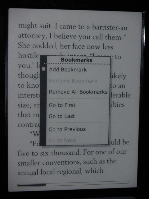 And it HAS bookmarking, jump to page, the ability to add in other TrueType fonts as well as MP3 support! Yes, Bookeen created a fully-functional bookmarking interface as well as a way to specify an exact page number for Goto Page! I'll be posting pictures today. Derek |