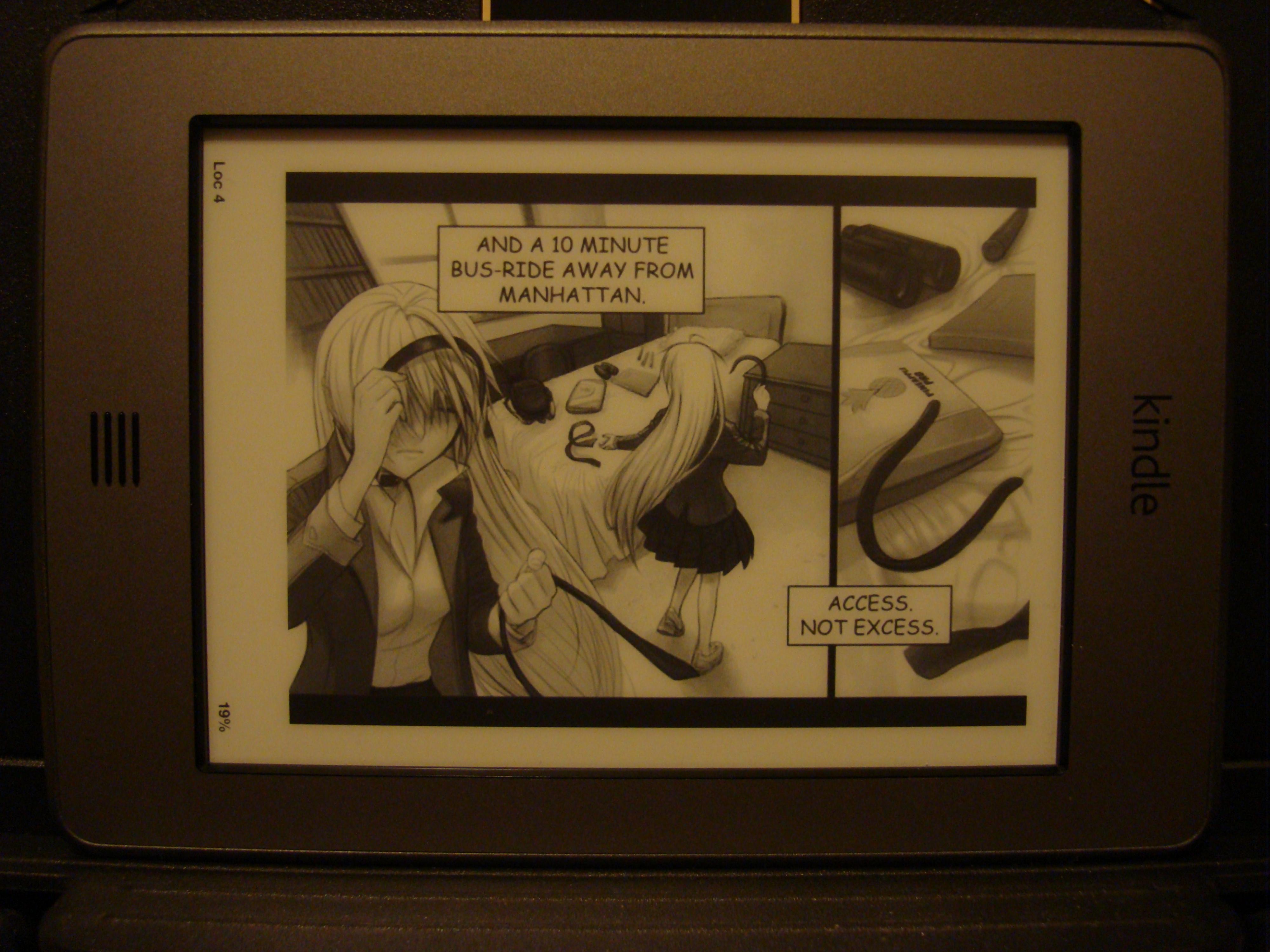 Probably some of you have noticed that although the screens of Kindle 4 is suitable for 600x800 images, there is always a big white border surrounding the book content. When reading a regular book, it wouldn't be an issue to have a white margin forced by Kindle. And it's totally understandable that we wouldn't want to see words at the edges of the screen so Kindle developers probably coded it that way to prevent words at the edges. However if you're reading a graphic novel/manga, the white border is not necessary, and it actually makes the whole image look smaller than it would with a full screen (either vertically or horizontally maximized). It would be great if there was a way to display all of the images full screen. However on Kindle 4, the only image that will use the whole screen is the cover image. All of the other images in the book content will have that white border around them and it seems that there's nothing that we can do about it. People who want to read graphic novels/mangas on their Kindles are searching for a solution but I think there is no solution yet.