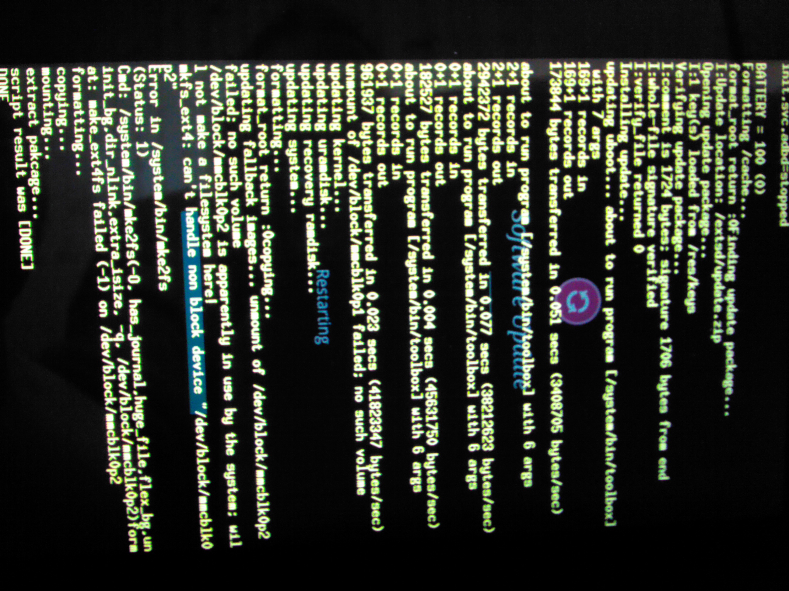 I have noticed if one presses the on button while holding volume up till green light comes on. Then release on button keep holding volume up and when the icons light up hold middle menu icon down. The screen will give you a read out of what the system is doing. Eg. It will show different processes running with a external SD card and update zip file than no card inserted.