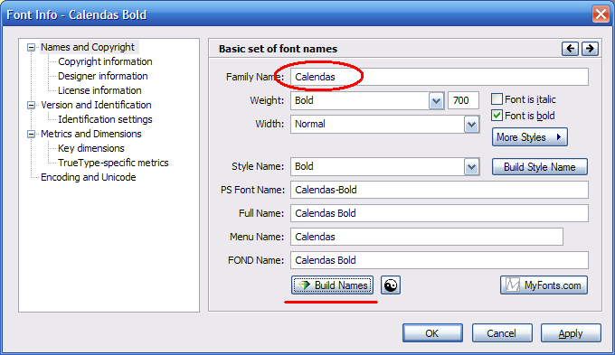 If I delete all the name fields (PS Font Name, Full Name, Menu Name, FOND Name) and click "Build Names", this comes up: Maybe your e-reader uses the "Menu Name" field? I'm not sure... since computer software (Windows or Linux) seem to pair them up by Family Name. Try to match them with whatever FontForge calls them and see what happens. Also, you should probably reboot the device or something after you add the fonts. Just sayin'. It could be something obvious like that. |