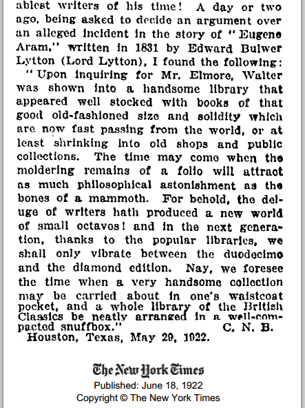 Interessant auch, dass schon Bulwer-Lytton in dem Zitat das baldige Ende des konventionellen Buches prophezeit. Wie lang solche Leichen immer noch rumtorkeln...