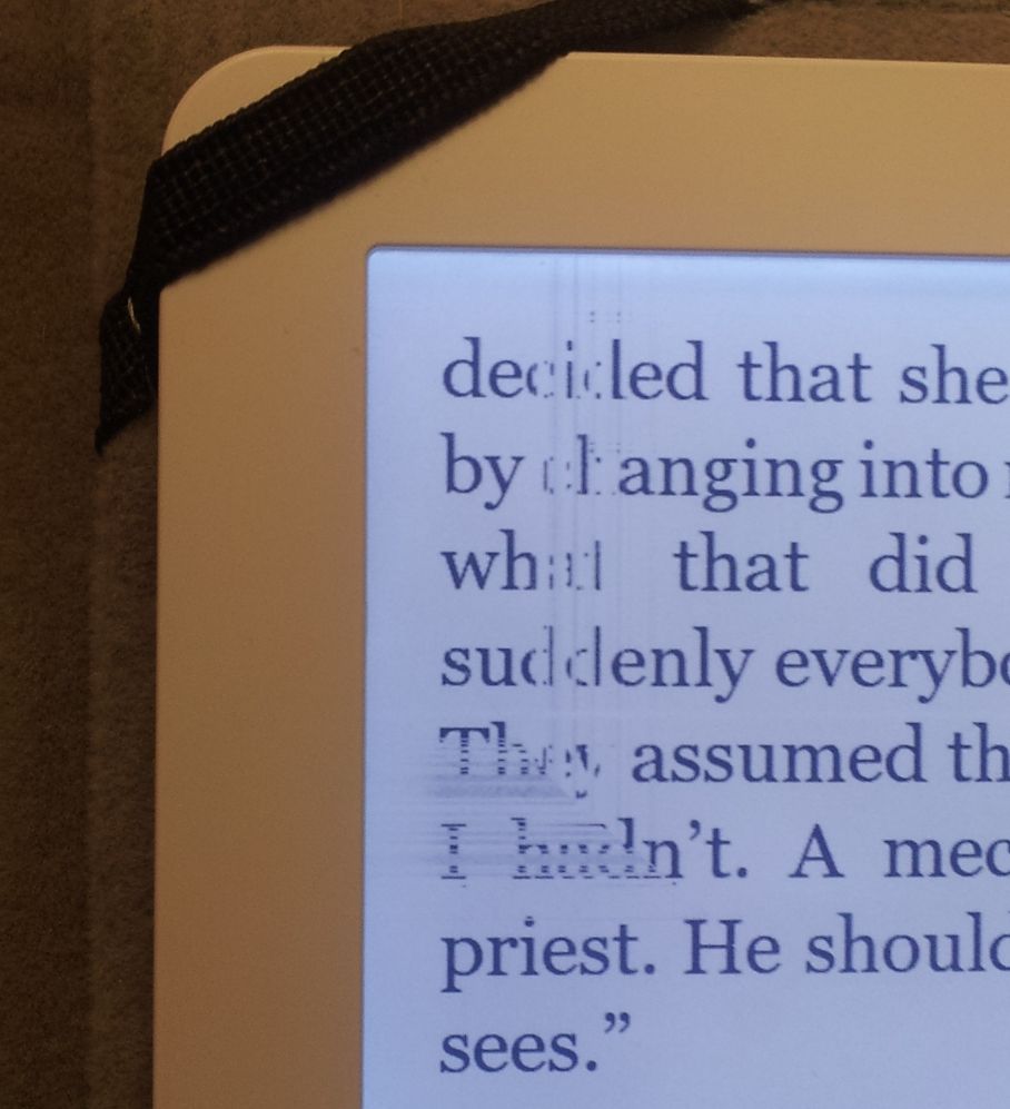 As for what caused it: do you carry your Kobo in briefcase/purse/backpack? Most likely cause is stress from twisting of the screen which a cover may help, but likely isn't sturdy enough to prevent twisting. Do a search on cracked substrate and you'll get all the details I am to lazy to retype right now. By the way - enjoy the book! IIRC the 4th wasn't one of the strongest in the series, but it's still pretty good. |