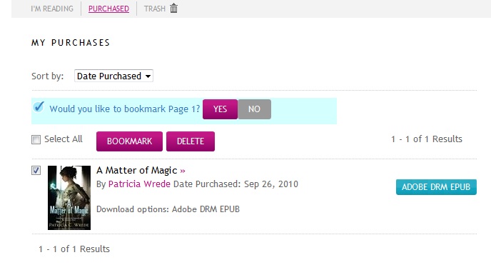 Thanks, but I just don't see any option for bookmarking anything in the Purchases tab. Clicking on the book title will only allow me to download as an Adobe EPUB. Right clicking it does nothing of use.