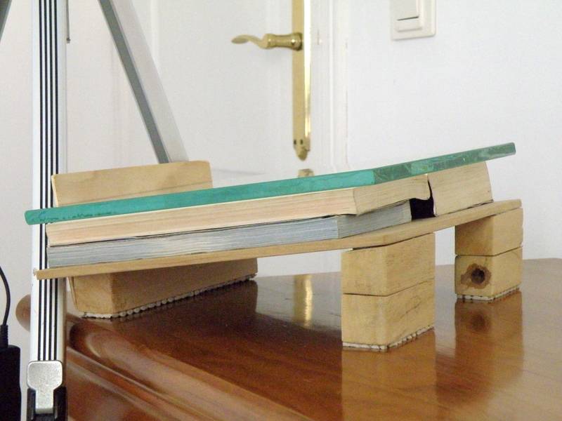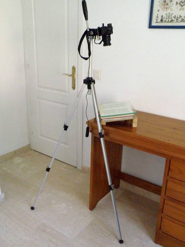 On the book is needed a piece of thick glass, whose weight keep the pages flat. It is convenient to use a remote trigger, to avoid moving the camera. The photos show the material that I use, which to me has the advantage of photographing two pages at a time. |