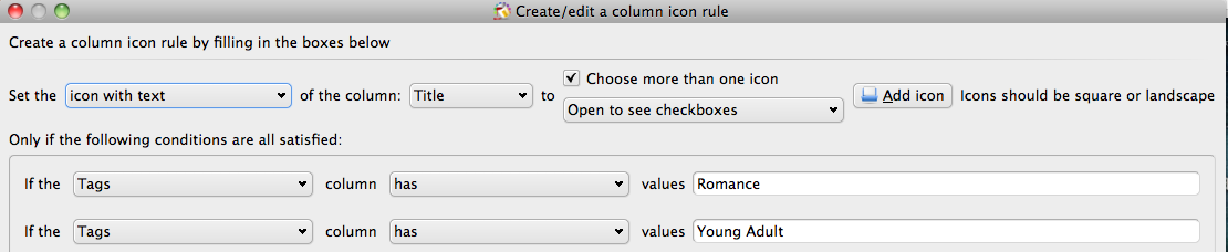 You can now have column icon rules display multiple icons in a single column, side by side. There are two ways to do this, either specify multiple icons when creating the rule, or create multiple rules that match the same book and specify the icon type to be 'composed' for every rule. See Preferences->Look & Feel->Column icons for details.