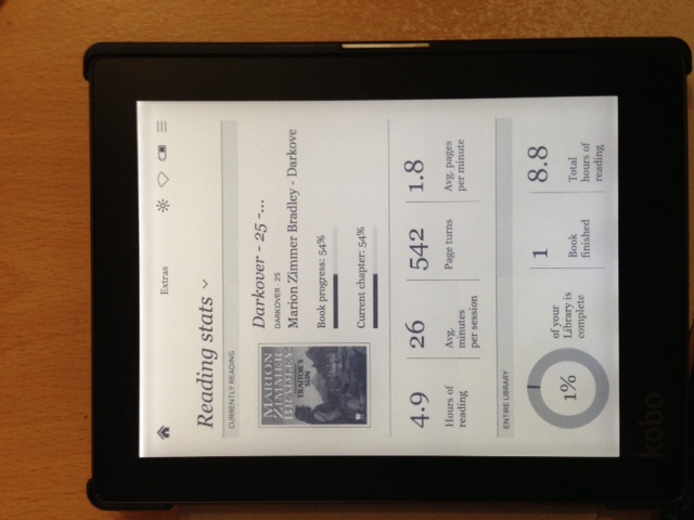 On my Kobo, I don't see have the bar graph icon for sideloaded kepubs which is used to bring up the time left to finish reading the current chapter, read the next chapter and complete reading the book. I still see the time remaining to read the book on the home page tile. One issue for me is that I find the times displayed are horribly inaccurate. Since I did a factory reset before sideloading the 3.0.1 firmware, I now show 25 books read in 18 hours. One kepub (Thankless in Death) I have open claims I will take 17 minutes to read the rest of the chapter (19 pages to go) and 18 minutes to read the next chapter with a total of 8.5 hours to read the entire book. The size of book that when I used to take the bus to work was my riding to work book with another in my bag as the riding home book. It could simply be that since I do factory resets rather often and so do not give the time required to do build a large enough sample of kepubs being read to give a decent estimate on my reading speed, a default and rather slow reading speed is used to estimate those times. There have been reports that Kobo will be re-enabling that feature for sideloaded kepubs in a future firmware. With that and $2, I can buy a coffee at Starbucks. Regards, David Last edited by DNSB; 11-24-2013 at 05:28 AM. |