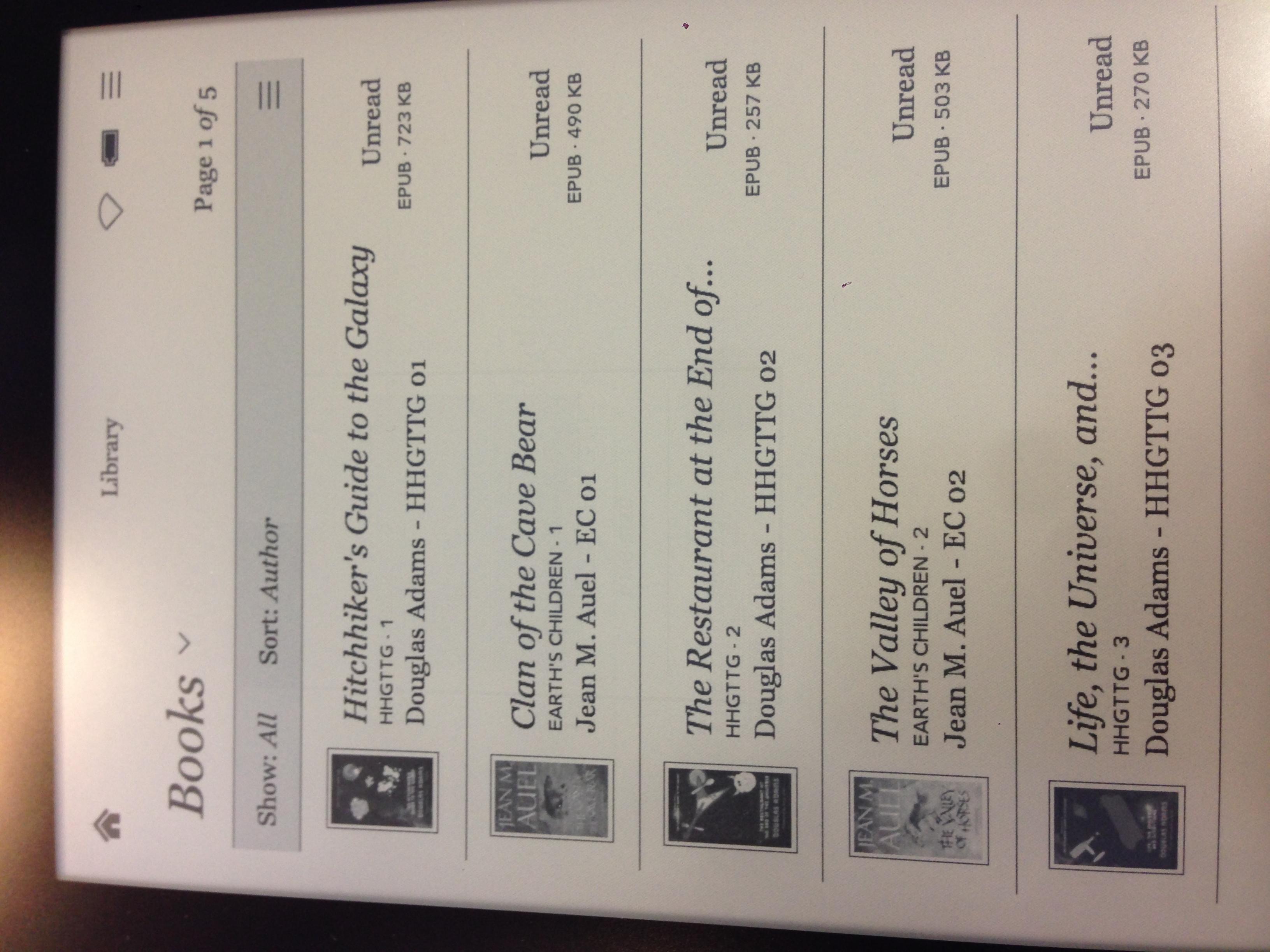I've purchased a Kobo Aura last weekend, after being a (mostly) happy owner of a Touch for a year and a half. Obviously I wanted to populate my library as optimally as possible and I'm one of those people who want their library sorted like author -> series -> series index. Previously, I used the calibre metadata plugboard to add the series & series index to the books' title (using the "{series:| - | }{series_index:0>2s}{title}" -> title template), but browsing these forums I found this post where people mention they appended the series information to the author field. I tried this, using "{authors}{series:| - | }{series_index:0>2s}" -> author as a template. I like the look I get, but I noticed something very weird, which has led to my posting here... The authors as displayed in the library look like this: Douglas Adams - HHGTTG 01 Jean M. Auel - EC 01 which looks ok. I expected them to be sorted like this, when I sort by author: Douglas Adams - HHGTTG 01 Douglas Adams - HHGTTG 02 Douglas Adams - HHGTTG 03 Douglas Adams - HHGTTG 04 Jean M. Auel - EC 01 Jean M. Auel - EC 02 Jean M. Auel - EC 03 Jean M. Auel - EC 04 etc. However, they come out sorted like this: Douglas Adams - HHGTTG 01 Jean M. Auel - EC 01 Douglas Adams - HHGTTG 02 Jean M. Auel - EC 02 Douglas Adams - HHGTTG 03 Jean M. Auel - EC 03 Douglas Adams - HHGTTG 04 Jean M. Auel - EC 04 Obviously this is just two series, when I load more series all #01's get sorted on top, then #02's and so on. When testing the template calibre sorts the field as I expected, so somehow this seems to be a Kobo (Aura) thing. Does anyone have an idea how the author field ends up sorted like this, and/or can suggest something to make the field sort as I expected? |