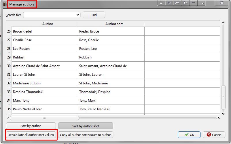 See attachment, try clicking the Recalculate all author sort values in Manage Authors BR Last edited by BetterRed; 04-07-2014 at 12:27 AM. Reason: correction to attachment |