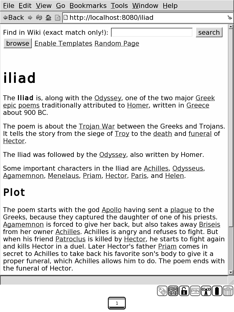 Mobileread member amirshim has created a method for browsing Wikipedia on the iLiad without being connected to the internet. His solution features a mini dump of Wikipedia, however, a full version is possible as well, with a bit more work.You can find instructions for setting it up yourself on his project page. I've created a package out of it that you can simply download, unzip, and copy to a memory card for your iLiad. You can find that installer here. (beware 54MB File) Join the ongoing discussion in this thread. |