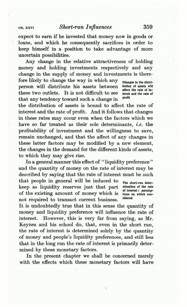 <p><span class="floatright">Changes in the distribution of assets will affect the rate of interest and the rate of profit.</span> Any change in the relative attractiveness of holding money and holding investments respectively and any change in the supply of money and investments is therefore likely to change the way in which any person will distribute his assets between these two outlets. It is not difficult to see that any tendency toward such a change in the distribution of assets is bound to affect the rate of interest and the rate of profit. And it follows that changes in these rates may occur even when the factors which we have so far treated as their sole determinants, <span class="italics">i.e</span>. the profitability of investment and the willingness to save, remain unchanged, and that the affect of any changes in these latter factors may be modified by a new element, the changes in the demand for the different kinds of assets, to which they may give rise.</p> <p><span class="floatright">The short-run determination of the rate of interest: assumptions on which considered.</span> In a general manner this effect of “liquidity preference” and the quantity of money on the rate of interest may be described by saying that the rate of interest must be such that people in general will be induced to keep as liquidity reserves just that part of the existing amount of money which is not required to transact current business. It is undoubtedly true that in this sense the quantity of money and liquidity preference will influence the rate of interest. However, this is very far from saying, as Mr. Keynes and his school do, that, even in the short run, the rate of interest is determined solely by the quantity of money and people’s liquidity preferences, and still less that in the long run the rate of interest is primarily determined by these monetary factors.</p> Code: