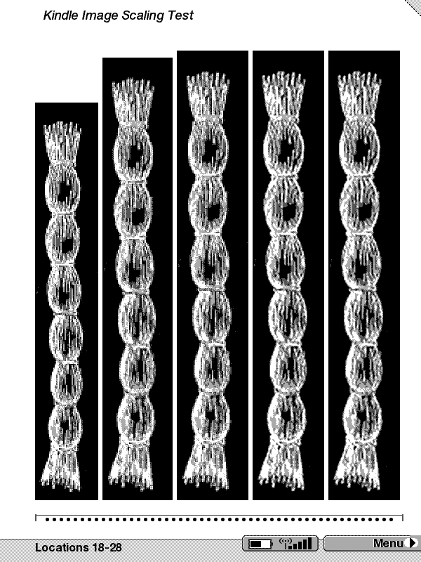The discovery of "zoom" mode for TOPAZ ebooks (Kindle's Sort Of "Zoom" Feature) turned my attention to images in MOBI/AZW ebooks on the Kindle. These do not have the zoom mode, even though an "image" mode is standard with MobiPocket Reader on most device types. However, small images are always doubled in size. This does not happen on other devices so far as I know, but it seems to be a good idea given the Kindle's screen size and the fact that very small images are common in older MOBI ebooks. On the other hand, complaints about the quality of images in AZW ebooks may in part be due to the small size of the underlying image. It would be much better to start with a larger image.