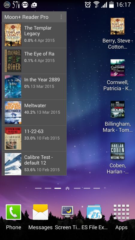 ![]() Some of the reader apps have very nice Home screen widget options and I suppose they're sufficient for anyone who only ever uses a single reader app. I think CC may be even better, though, especially if CC could 'remember' which app was last used to open any particular book. As background I've attached widget screenshots from my Galaxy Note 3 of the offerings from 3 apps - Pocketbook, Moon+ and Mantano. The best I've used have been Pocketbook and Moon+ (unfortunately IMHO Moon+ makes such a mess of css styling that I can't reconcile myself to using it for epubs).
