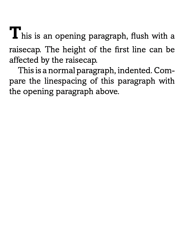 On the left is an epub with a raisecap, the raisecap span has its line-height set to zero to prevent it affecting the line spacing of the rest of the paragraph. On the right is what happens when that line-height style is removed: |