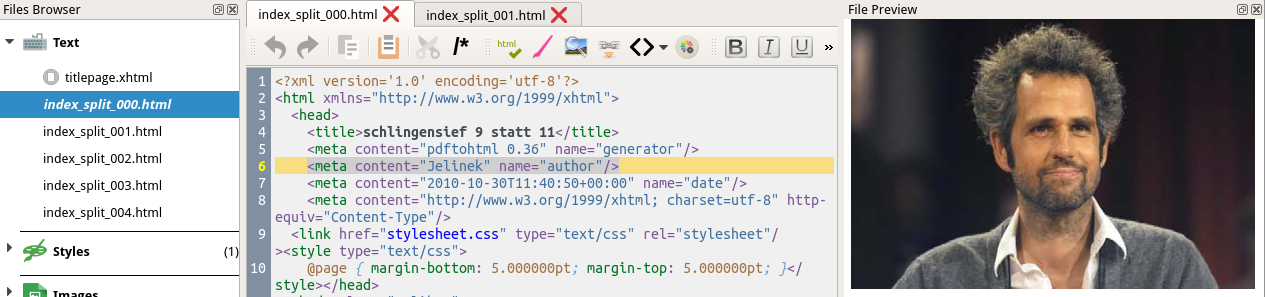 ![]() A book, partly with an image & text (heading Schlingensief) aus Elfriede Jelinek: Schlingensief with virtually no metadata, the origin of the last 3 chapters are still unknown. To find any clues for some metadata the search in the E-book viewer for Jelinek results exactly 5 hits, the image and 4 times the headings - although the word Jelinek doesn't exist here at all. Shouldn't the search of the E-Book viewer only browse the real, visible text!? Check Book OK. Search in Edit Book shows Jelinek in every chapter (index_split_000.html to index_split_005.html) once. Edit Book_Search Jelinek index_split_000.html & ... index_split_ 001.html OT Obviously this book wasn't created with calibre, see the counting 000 etc. Last edited by chaot; 11-14-2015 at 06:58 AM. Reason: no changes |