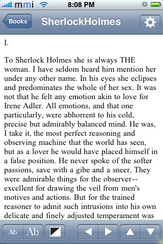 A note for daffy4u--Stanza (and now) eReader allows you to have black background with light text. As far as I can tell, Stanza gave me more control over both the foreground color as well as the font size, but eReader's options were suitable. I think the JPGs are blurred compared with what it looks like on the iPhone itself. |