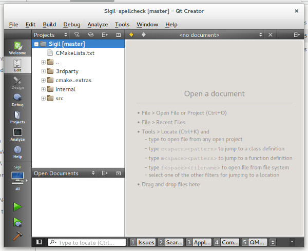 QtQreator is running .[File]->[Open File or Project] menu shows "Open File" box, let's navigate to source folder (Sigil) and chose the "CMakeList.txt" file there. QtC shows then "CMake Wizard" and wants to know where we shell build Sigil, I just Next'ed its proposal. Now it wants to "Run CMake" and offers us an opportunity to give it some arguments. I use something like this: Code:
