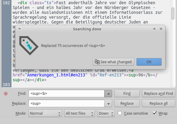 ![]() Aim is an uniform (unbold) endnotes format. <sup>94</sup> vs. <sup><b>95</b></sup> My relevant regex skills are still basic, so simple F&R and Replace all. Searching done_Replaced 75 occurrences Subsequently, in a second step, the rest would then done. Find: </b></sup> Replace: </sup> Previously, indeterminate motives let me run Check book. Check book_Parsing failed: Opening and ending tag mismatch ... as it was to be expected. But not only in 3 cases, but in 75. Why Check book shows only 3 errors? Run: Try to correct all fixable errors automatically Run Check book again: No problems found Control: Find: </b></sup> Result: No matches were found for </b></sup> This means Check book had corrected all 75 occurrences, but showed only 3. Whether these were the 3 first ones (left to right procedure), I can not say for sure. Does that have to do with smart settings !? This should be a joke! Interna: Conze (DAudV) Last edited by chaot; 06-02-2016 at 11:15 AM. Reason: add Interna |