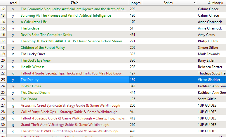 the doewn arrow -> skip to a firrent book with caontans the relevant letter only happens if such a book exists on the screen slection. so If i want to eid the "i" to an "y" on a book near the end of the list, and there is no book below it with an i in the title , then there is no skip. the drop down list stays open and allows me to select "y" usually I have a short list of in- progress books so maybe I've just not been meeting the trigger condition in the past but it is not sensible that the behaviour of a text selector on one row should be influenced by what may or may not be present in a different column on other, lower down rows ? |