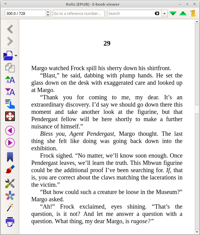 If I jump forward in a book, the viewer loses its brains for wrapping text. Each paragraph becomes one long line that disappears off to the right of the viewer, never to be wrapped. This is a repeatable problem. Example: Book: "Relic", by Douglas Preston & Lincoln Child Open in viewer: Progress indicator at upper left of viewer displays "1.0/728" Overwrite "1.0/728" with "300", hit enter, to jump to page 300 of the book Note that text does not wrap Note that purple "Next Page" button does not advance page Randomly jump around in book using vertical scrollbar on right of viewer After a bit of random jumping, wrapping starts to work again This happens in other books too, I just picked "Relic" as an example since it's a commonly found book that others may well have to test for themselves. The two attached screenshots below illustrate the "no wrap" error case, and the "correct wrap" case (after jumping around randomly and returning to page 300). Last edited by haertig; 10-28-2017 at 01:28 PM. Reason: Added more information |