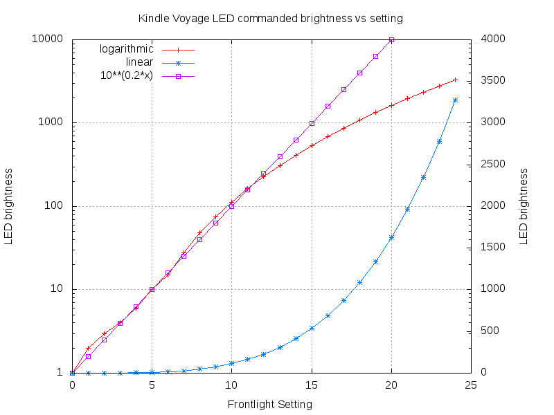 But it turns out that the linux device driver for the Voyage power supply exposes some useful information in /sys/class/power_supply/max77696-battery/, including current and voltage, now and averaged, which can be accessed on a jailbroken device. In addition, there is a directory /sys/class/backlight/max77696-bl/. (I suspect amazon inherited a device driver assuming a phone or PDA.) I made a table of /sys/class/backlight/max77696-bl/actual_brightness value versus Voyage brightness setting, which is plotted in the attached brightness.png for logarithmic and linear scales ( human brightness sensitivity is approximately logarithmic https://en.wikipedia.org/wiki/Weber-Fechner_law ). 10**(0.2*x) is also plotted for comparison. (I'm using 0.2 just because it is such a close match for the first half of the plot.) There is every reason to believe that the increase in power used for each step is larger than the increase for the previous step. The questions are how much, and does it matter? If you see no problem with how long your battery charge lasts, or don't care how brightness affects battery life, then it does not matter to you. Others might care or just might be curious. So far, I am in the curious category, but for the Oasis 2, I might also want to take power use into account. Anyway, I wrote RUNME.sh scripts to make battery discharge current measurements at each brightness level. The results are plotted in the attached led_ma* PNG files. I've also included the scripts and measurement data in LEDma.zip attached in the next post . More later. |