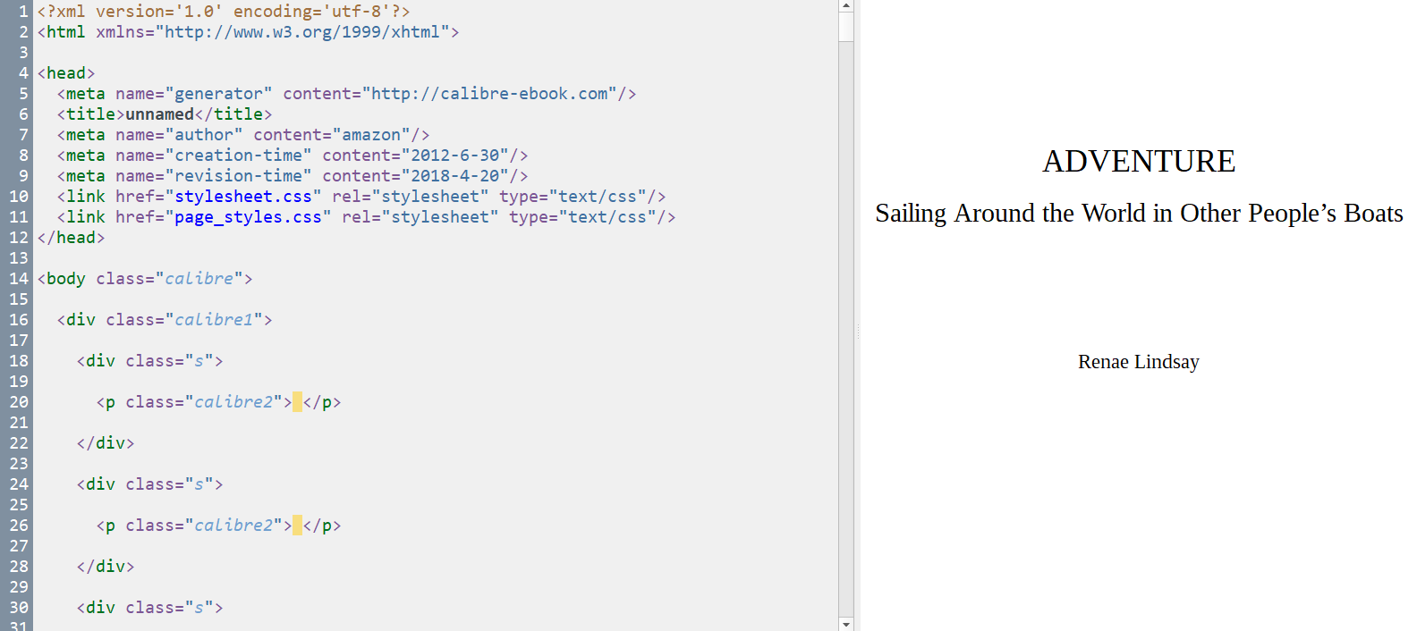 First two are examples of what I'm looking at when I'm trying to edit it in Calibre. The third one is KDP's response when I try to upload anything with the page break code above. The text sample contains the biggest part of my issue. It splits the table of contents in half every time, despite there being plenty of room for it. This sample doesn't have the manual page breaks I had been using for the full document, I actually removed them in the hopes that it would simplify what I was looking at in Calibre so I could put the page breaks back in myself (seeing as it was largely ignoring them anyway). The page is formatted 6x9, like it was for print. I'm not sure if that would change anything. |