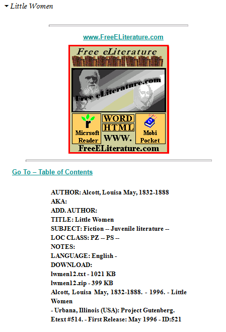 [font=Arial, Helvetica, sans-serif]Project Gutenberg is our major source of these great works (so far). Our first step is to convert their plain text files TO READY TO READE-Books for your PC, PDA or Tablet computer, then post them to our WEB SITE for free downloading. [/font][font=Arial, Helvetica, sans-serif] I'm not sure Diesel Ebooks wants to associate their own company with that. The books clearly show they come directly from Project Gutenberg's archive. [/font] Also, why are they all in .lit format, the most-restrictive and unusable format available? |
