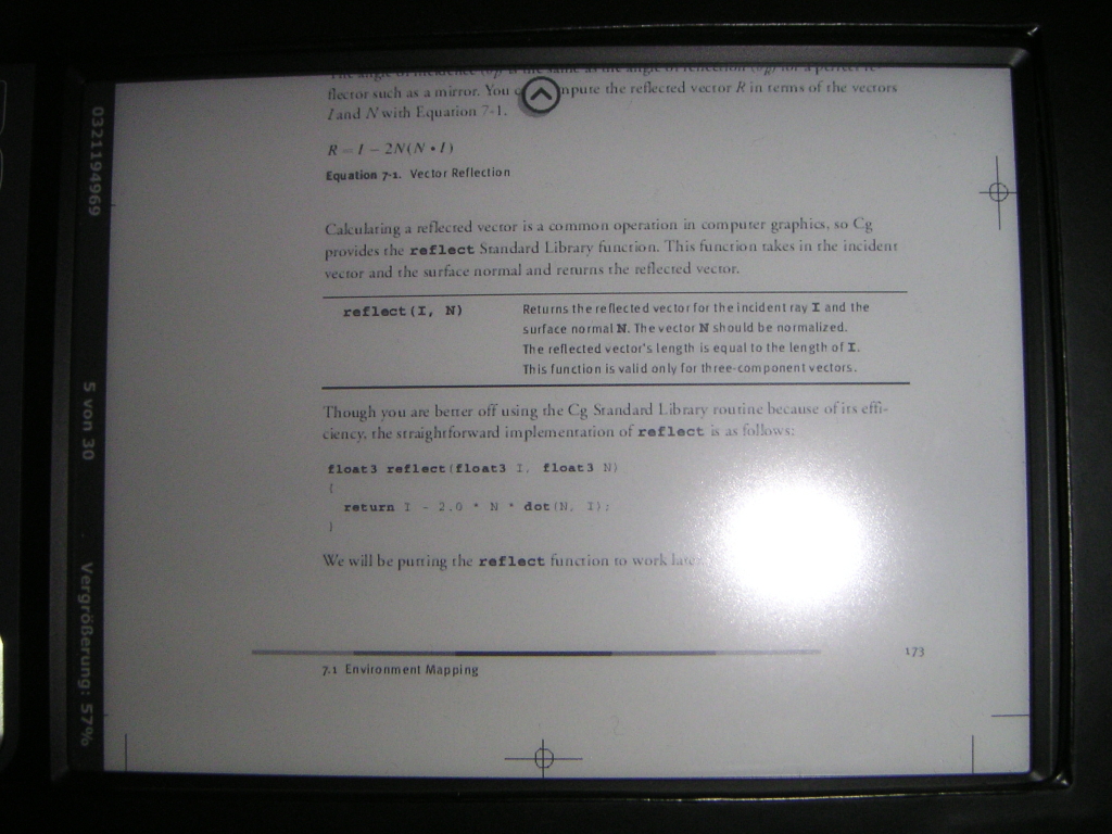 1)The Cybook can handle the kinds of PDF files I want to throw at it decently 2)How the PDF reading experience is in the device. I don't mind a little of horizontal or vertical panning and zooming if I can get the nice form-factor of the Cybook (Iliad is too big for my intended use, and too expensive) I was wondering if any Cybook Gen3 owner with the new firmware build 796 would mind posting a few thoughts and a few shots of complex PDF files opened in the device. Here are a couple of (legal) PDF files that are interesting to me: http://developer.nvidia.com/object/c..._excerpts.html Could someone give those PDF files a try and give me some input? Thanks a lot! |