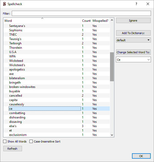 ![]() If a misspelt word is peculiar to a document, e.g. a place name, persons name etc, I add it to the custom dictionary. When I finish a document I replace RoamingCustom.dic with a 'starter' version of it, which gets rid of the document specific "Added" words. It's the nearest I can get to having a document specific custom dictionary. I can't recall which WP program I used that had them - WordPerfect, Multimate, Gypsy, who knows ? From time to time I consider saving the end of checking RoamingCustom.dic file to the calibre book where I have the DOCX, but I never do. So, when I hit Recheck Document I don't get many misspellings that I have to Ignore Once again. Quote: