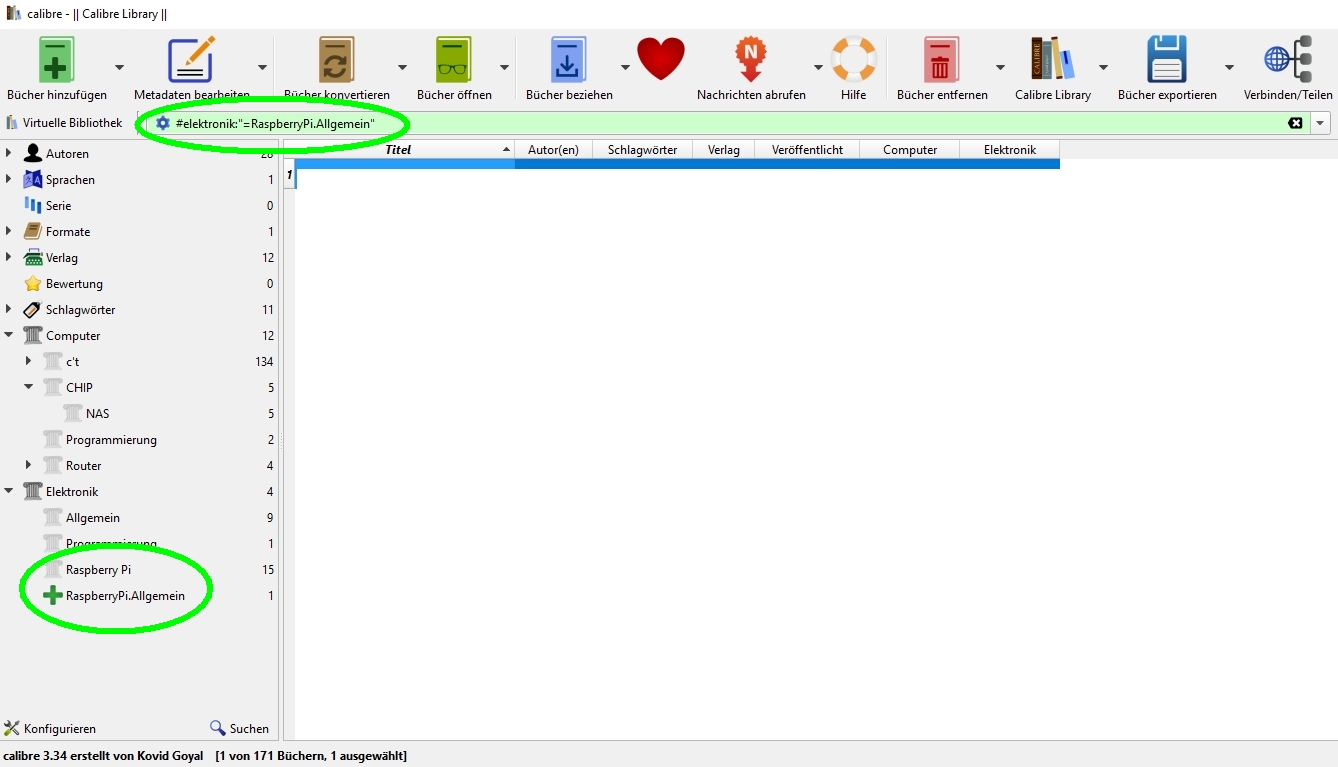 I just started with Calibre, but now I have problems to sort books in custom columns: 1. I generated two custom columns "Computer" and "Elektronik" on the same way. 2. I added user data to the "Computer" custom column (see Calibre-01.jpg, red markings) to generate a new subdirectory "CHIP" and in there the subdirectory "NAS". It works! 3. I added user data to the "Elektronik" custom column (see Calibre-02.jpg, green markings) to generate a new subdirectory "RaspberryPi" and in there the subdirectory "Allgemein", but it's not working. I have no idea what's the difference between both custom column (max. length of entries ???), but I don't found a solution for this problem. Thanks for any help!! Paul |