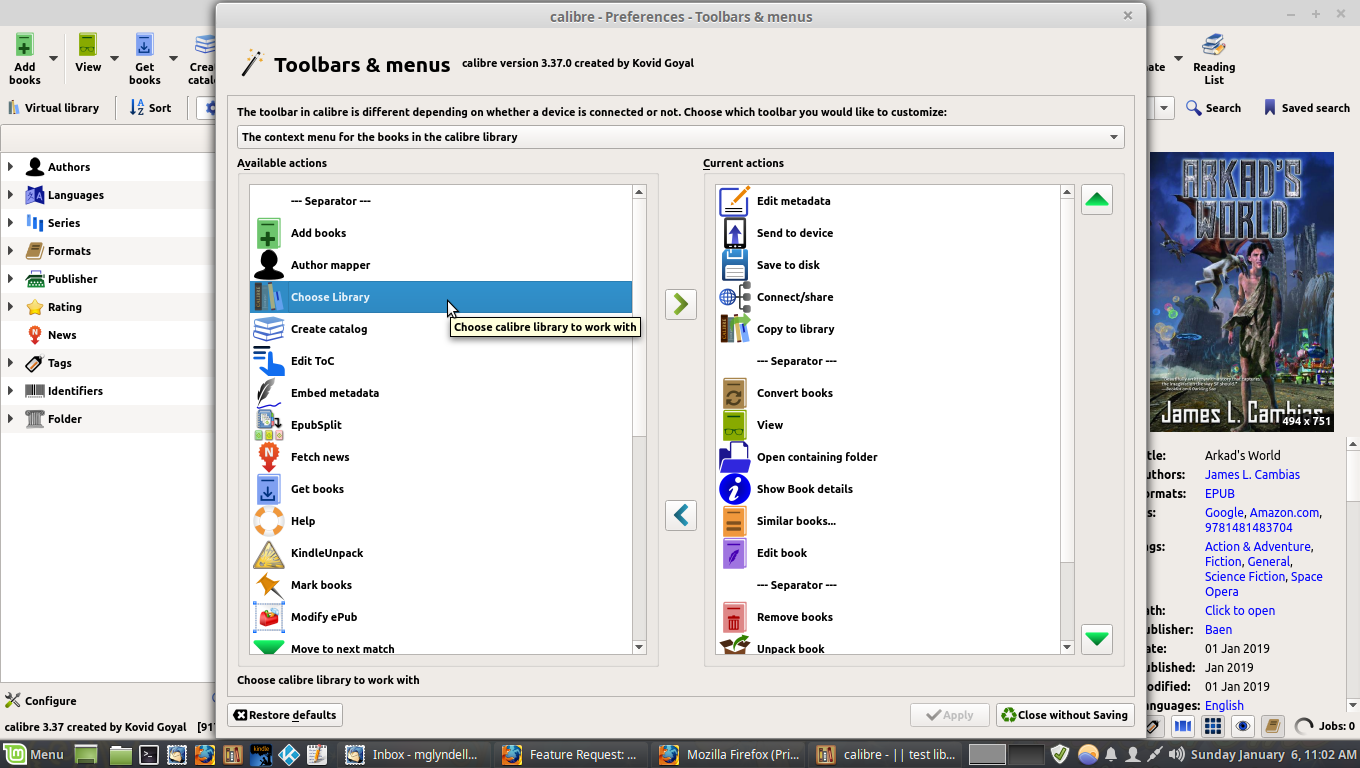 The Favourites plugin allows the user to cherry-pick individual options from individual Action items - it's one of the lesser knows calibre gems. Aside: I don't need to switch as much since the CalibreSpy plugin came into being last year. With it you can concurrently view multiple libraries on a Read-Only basis alongside the regular calibre library manager. BR |