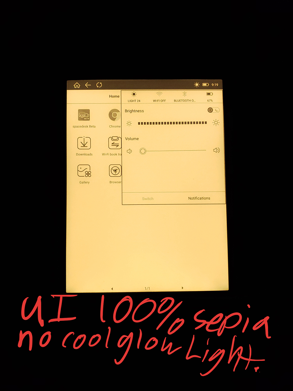 I use Moon+ Pro on all my devices to read with as I use a very specific way of re-flowing the text so it's easier on my glaucoma eyes. I imported all my settings from the T80S to the T80D and discovered a bug but also now a great feature. I have the slider on the left side of the screen for brightness adjustment turned on and it allows you to change the android display brightness. The device reports the normal cool light as the display light to the app and sepia tone leds are off a separate circuit for the device. I keep the stock ui set in sepia mode (sun) and when in moon+ the slider can be off (no light but since its not connected the ui sepia settings stay) or light on at a set level. This allows you to set the cool light with the sepia and mix them for your preferred temperature. if you go to to high on the level then it will be mostly cool and very bright as it brings the cool light to 100% while leaving the sepia at whatever level you have it at in the ui. So what I do is make my temperature then open the ui brightness menu while still in moon+ and lower or raise the brightness of the sepia in the ui to make it at the level of brightness I want while keeping the same temperature in moon+. I took some pics to better explain what it does but it is basically like a getho kobo forma.