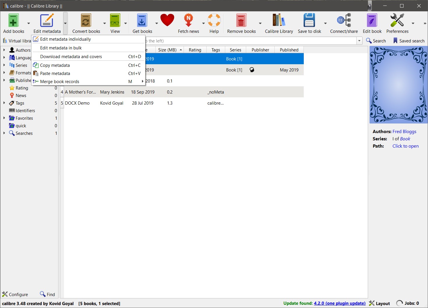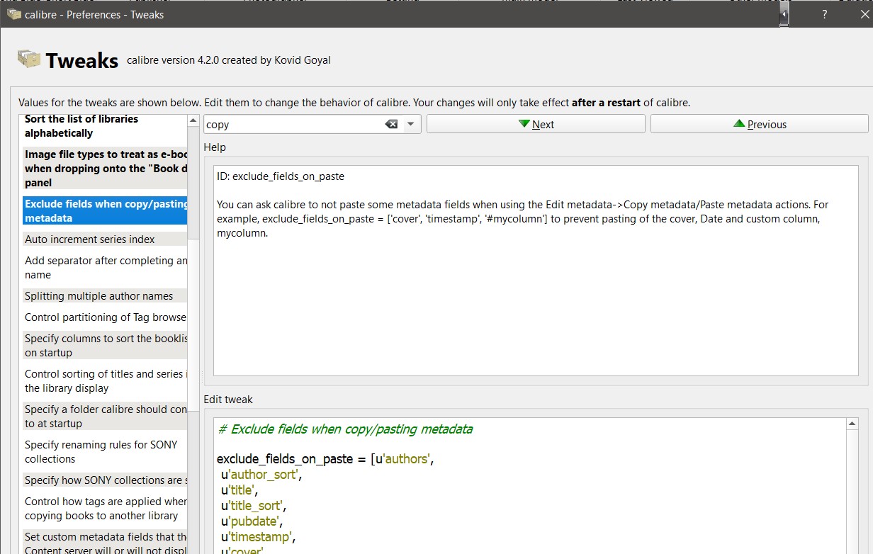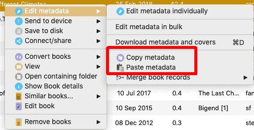 You need to set the kbd shorts - probably Cmd+C and Cmd+V And don't forget the tweak You use it on the book list; select the book who's metadata you want to copy, then press Cmd+C, select the book into which you want to paste the copied metadata, then press Cmd+V. BR Last edited by BetterRed; 10-28-2019 at 06:15 AM. |