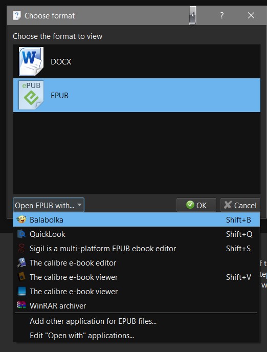 You can add a program to a file type Open With list thus: Right click on the file type, e.g. EPUB, in the Book Details panel and select Open EPUB with... Added: You can add & edit Open with programs in the Tag browser: This will present a list of previously assigned programs, Click the Browse computer for program, which will open up a file manager open file dialogue, browse to the program you want - such as Sigil That's how to configure - now how to make use of it For frequently used programs I assign a keyboard shortcut to the program: For occasional use programs I use the View specific format tool, where there's same the Open XXXX with... option This is what I have for EPUB in my Books library The blue ebook viewer is from a portable 3.48 (I changed its icon to differentiate) BR I got fed up with posting this response, in future I'll just post a link Last edited by BetterRed; 04-21-2025 at 07:38 PM. |