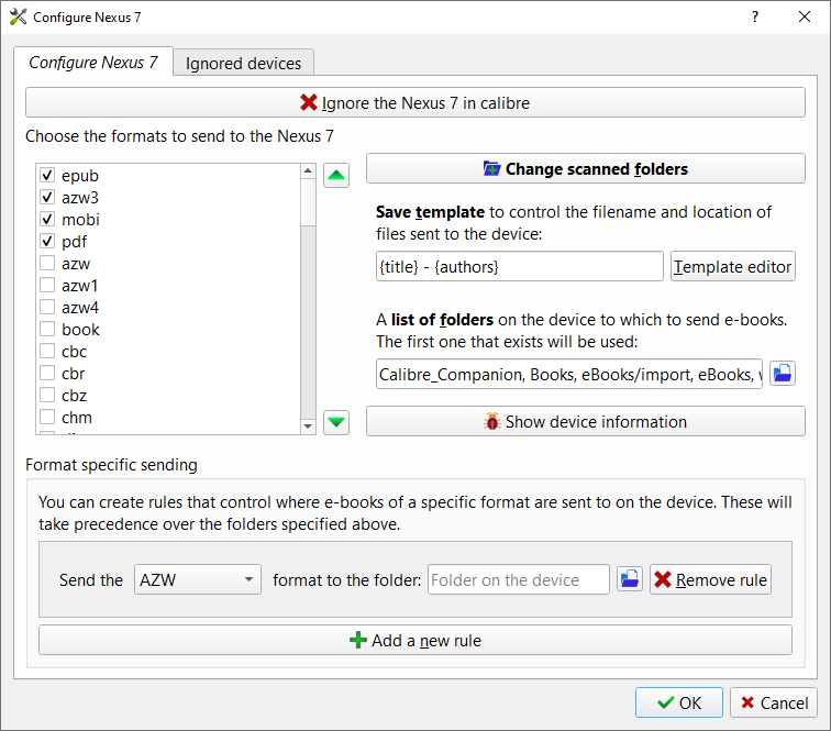 That said, connect your Kindle Fire, click on the arrow beside device and then click on Configure this device. The first configuration tab should show a list of file types. I would suggest locating epub, selecting it and then using the arrows to move it to the top of the list. See attached image for configuring my Nexus 7 as a MTP device with calibre 4.23 |