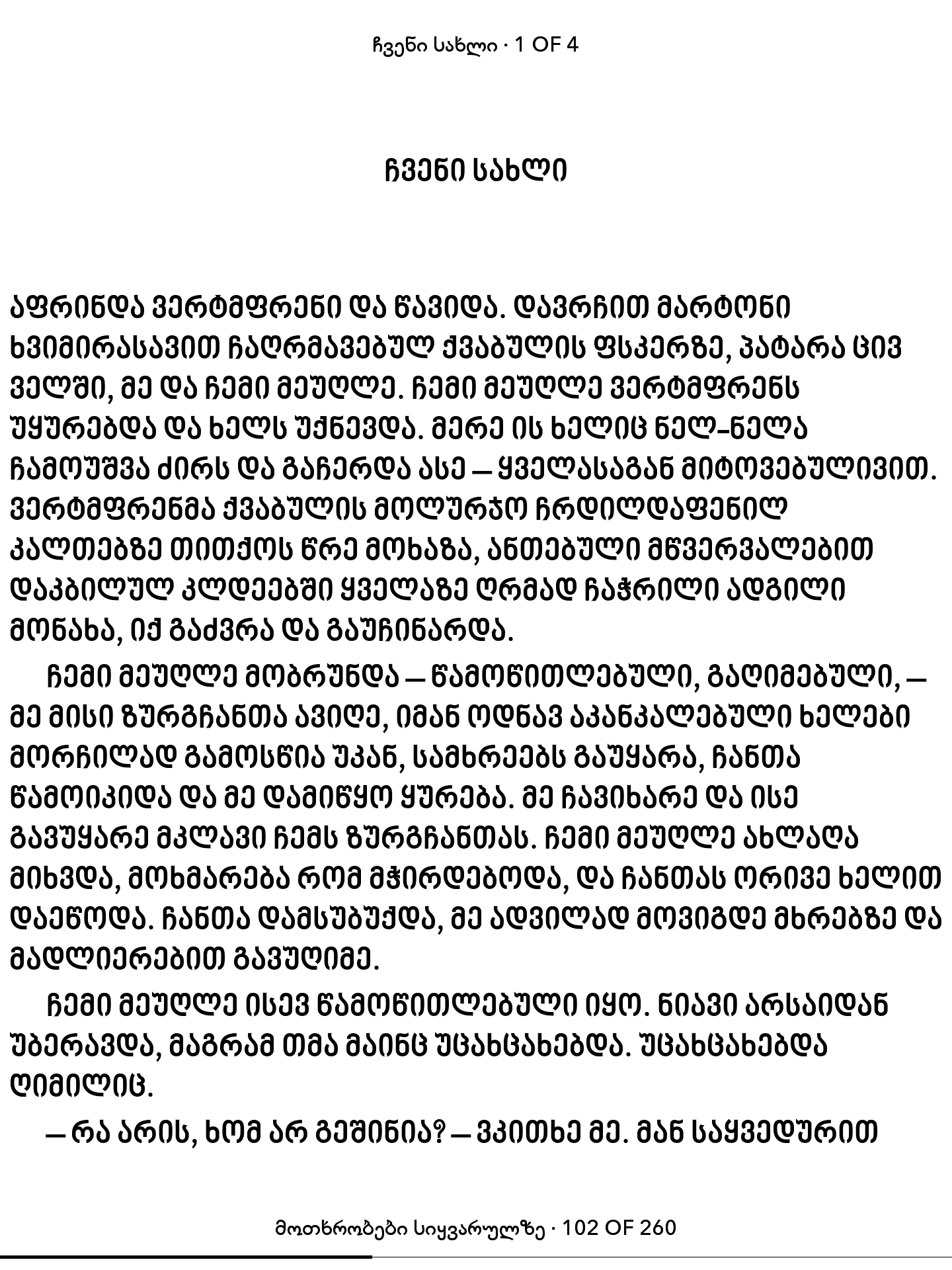 I'm going to purchase the Kobo Clara HD. However, most of my books are in Georgian language (Titles, author names) https://en.wikipedia.org/wiki/Georgian_language Before I purchase, could anyone help me testing if Kobo's system font/gui supports the Georgian characters? Any screenshot/photo would be helpful! Here is one of the books for testing https://drive.google.com/file/d/1c_p...ew?usp=sharing (also attaching the file) |