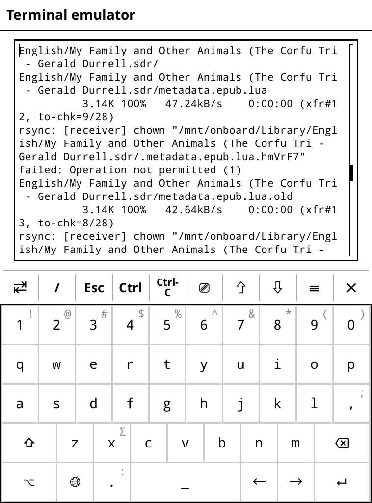 First time poster here! :-) First of all, kudos to KOReader's developers for building such a fantastic application. In addition to KOReader, I also installed NiLuJe's Kobo Stuff, and I'm trying to use rsync as an alternative backup solution. It works fine for pushing stuff to a remote machine: rsync -avhz --delete -P -e "ssh -p 22" /mnt/onboard/Library/ user@127.0.0.1:/path/to/library But rsyncing the opposing way (rsync -avhz --delete -P -e "ssh -p 22" user@127.0.0.1:/path/to/library/ /mnt/onboard/Library, gives me a bunch of errors: Am I missing something obvious here? Thank you, Dmitri Last edited by issybird; 04-20-2022 at 05:29 PM. Reason: Oversize image attached as thumbnail. Please read the guidelines for limits on image size. |