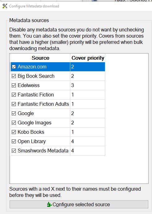 BUT your ISP (x.x.x) could be on the blocklist or your country could be blocked (firewalled) ping the target IP Or it could simply be the sources you chose are NOT licensed for where you are (georestricted) Some metadata sources can be configured to use other sites. Select: use the configure source button. Examine each sources setting choices as the differ (I show Amazon which supports their various sites) |