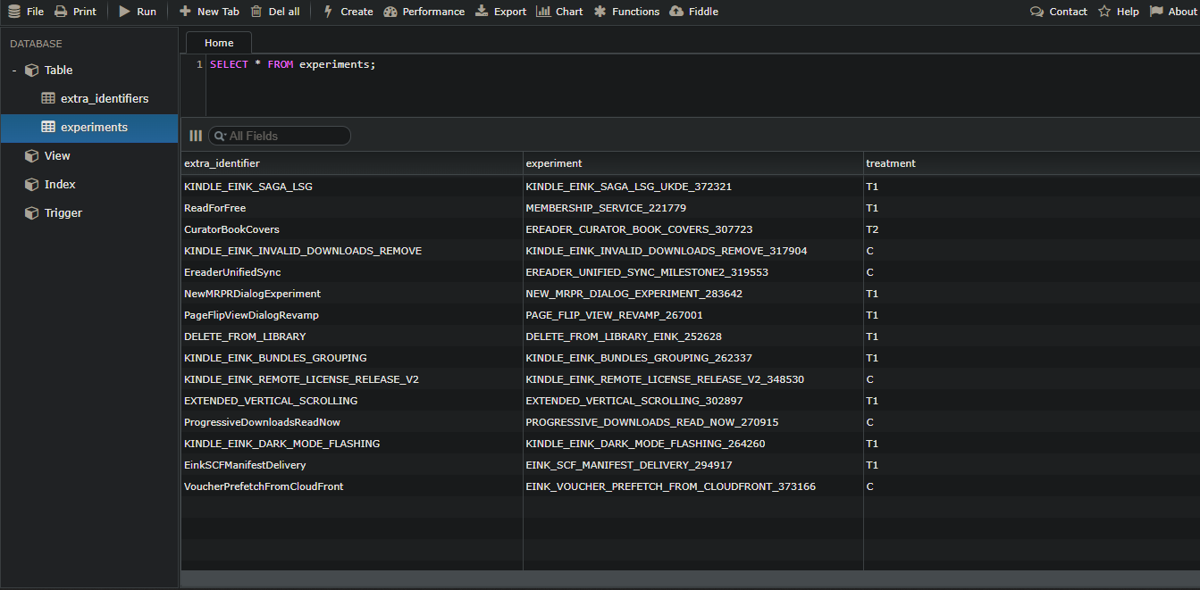 sqlite> select extra_identifier, poll_interval from extra_identifiers; DecanterChromeV1|30 KINDLE_EINK_REMOTE_LICENSE_RELEASE_V2|0 CuratorBookCovers|0 sqlite> select extra_identifier, experiment, treatment from experiments; DecanterChromeV1|DECANTER_CHROME_V1_FALLBACK_328845|C DecanterChromeV1|DECANTER_CHROME_V1_MALBEC_FALLBACK_370896|C CuratorBookCovers|EREADER_CURATOR_BOOK_COVERS_307723|T2 sqlite> .exit Last edited by tekkasit; 08-11-2022 at 02:01 AM. |