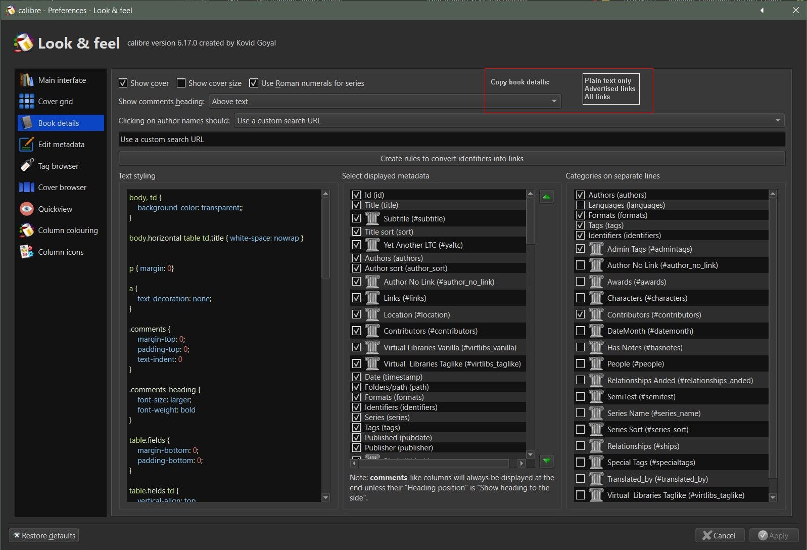 <tr> <td bgcolor="transparent" style="vertical-align: top"> <p style="margin-top: 0px; margin-bottom: 0px; margin-left: 0px; margin-right: 0px; text-indent: 0px; background-color: transparent"><strong style="font-family: 'Segoe UI Mono','Consolas','monospace'; font-size: 13px; background-color: transparent">Publisher:</strong></p></td> <td bgcolor="transparent" style="vertical-align: top"> <p style="margin-top: 0px; margin-bottom: 0px; margin-left: 0px; margin-right: 0px; text-indent: 0px; background-color: transparent"><a href="action:7b227465726d223a20227075626c6973686572222c202276616c7565223a20224a6f686e20486f706b696e7320556e6976657273697479222c20226669656c64223a20227075626c6973686572222c2022626f6f6b5f6964223a203832302c202274797065223a2022736561726368227d"><span style="font-size: 13px; color: #6cb4ee">John Hopkins University</span></a></p></td></tr> <tr> IMO it should be be possible to copy something more like this (from the calibre://show-details link labelled Self), i.e. plain text: The columns that are shown in blue which I've boxed in red are virtual columns, IMO they shouldn't have a href="blah blah…" coding. Whereas calibre://, http://, file:/// etc links (i.e. advertised protocols) should retain their a href="blah blah…" coding. BR Last edited by BetterRed; 05-07-2023 at 07:25 PM. |