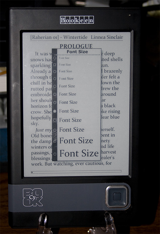 Derek P.S. I'll grant that the smallest font size is too small to be comfortably readable for me, even when I'm wearing my reading glasses, and the largest just doesn't leave all that many words on each 'page' displayed, but it's quite a range of font sizes. |