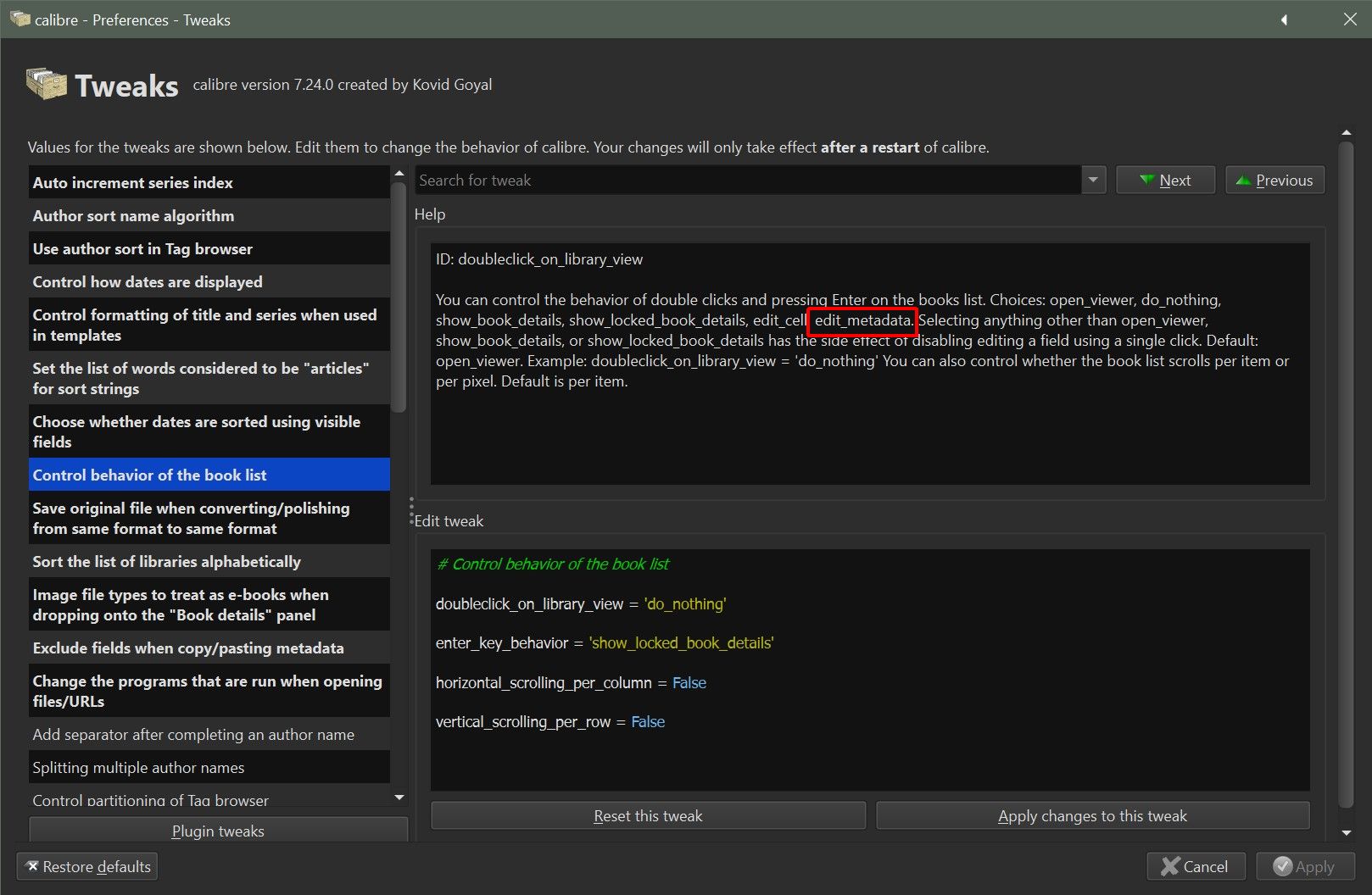 I'd like double-click to edit metadata. I found the setting at Preferences->Tweaks->Control behavior of book list , but I don't know what to set it to.