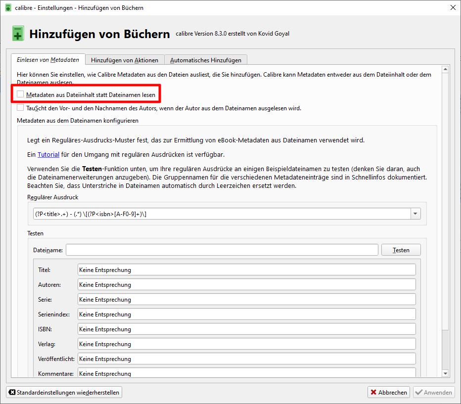 thanks for the quick response. I think to explain more in detail 1. System: Windows 10 / Calibre 8.3.0 2. Testfile https://www.uni-muenster.de/imperia/...ungen_pdfa.pdf 3. Preferences (see pictures 001,002,003) 4. Resluts with "Embed metadata" (004) and "Interface Demo Plugin" (005) I also use PDF-XChange Editor. |