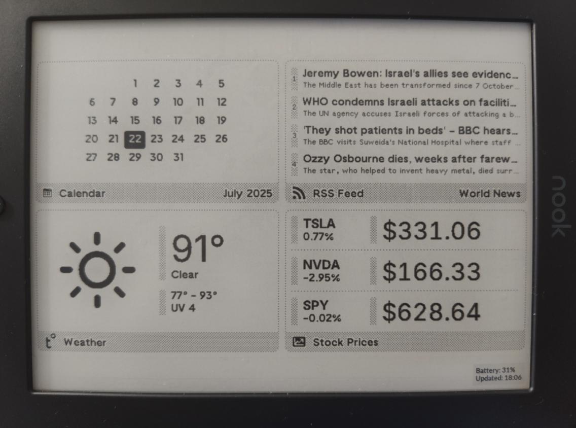 Regarding the project I was working on - I've since discovered TRMNL, an e-ink dashboard solution that's even more versatile than my original project. TRMNL offers hundreds of plugins for displaying everything from stocks and weather to quotes and poems. Instead of continuing on my own custom dashboard, I decided to leverage their existing platform. The implementation was surprisingly straightforward - essentially just grabbing an image from their server or a your own TRMNL server. But the real game-changer is the extensive plugin ecosystem. It transforms the Nook into a dynamic, customizable information display. Much easier than having to connect all the different APIs and whatnot in my own application. I've attached some images to show what it looks like. Anyone interested can check out the project on GitHub under trmnl-nook. |